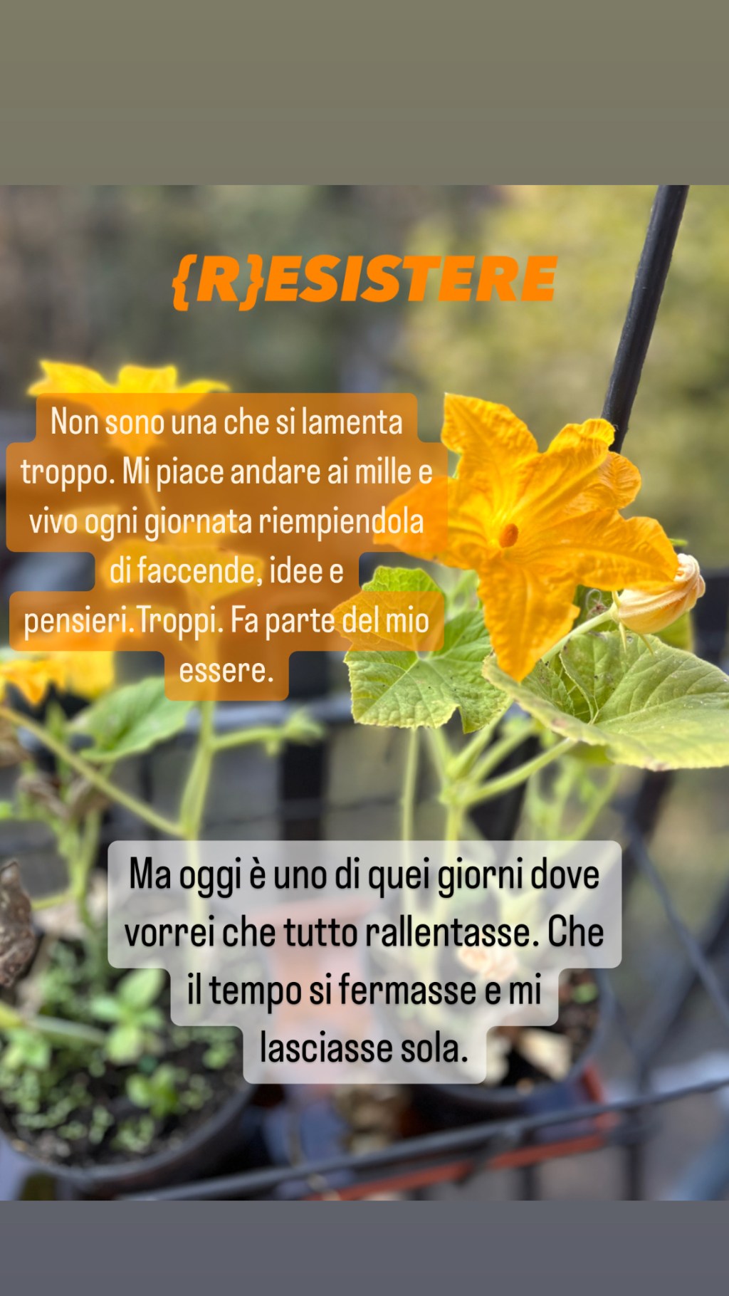 E così oggi è una di quelle giornate in cui (R)ESISTO. Nulla cambia. Ci sono sempre le solite incombenze da fare. Gli stessi pensieri a farmi compagnia. Sono solo io diversa. Stanca e spenta. Capita a tutti. Anche a me.