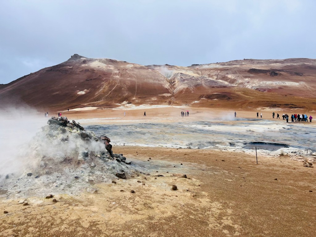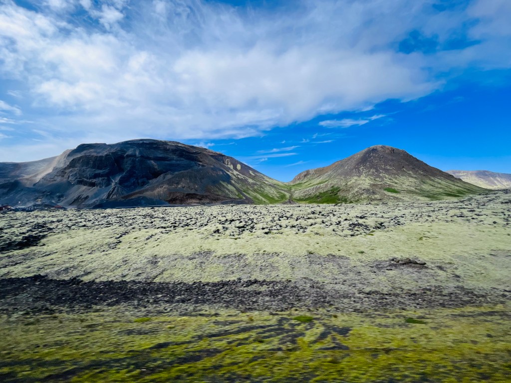 Il terreno è molto scuro per la solidificazione della lava o dei getti provenienti dalle sorgenti calde che fuoriescono ovunque, ricoperto da un sottile strato di erba e muschio color verde oliva. Una combinazione davvero unica per gli occhi!!